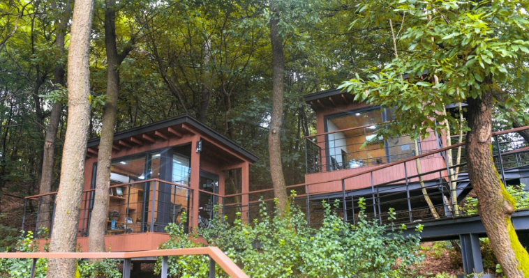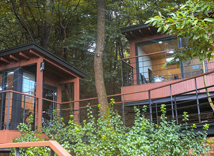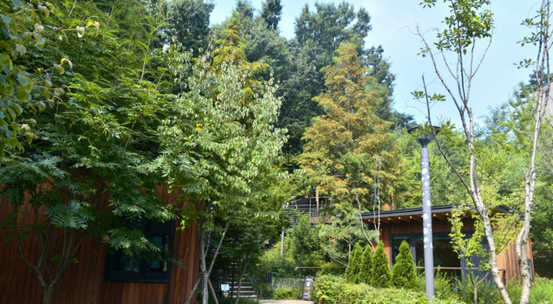 '책뜰'은 도서관 옆 숲 속에 5동의 시설로 이루어져 있습니다. 금강초롱, 물봉선, 산수국, 백리향, 바람꽃, 금강초롱이 숲 속에 자리 잡고 있으며 독서캠핑장 콘셉트에 휴식처 입니다.