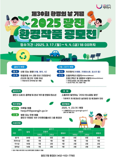 - 광진구: '소통하며 발전하는 2050 탄소 중립 광진'을 주제로 '2025 광진 환경 작품 공모전'을 개최합니다. 초·중학생 및 동 연령대 청소년을 대상으로 글쓰기와 그림 그리기 부문에서 작품을 모집하며, 수상자는 2025년 4월 23일에 발표될 예정입니다.